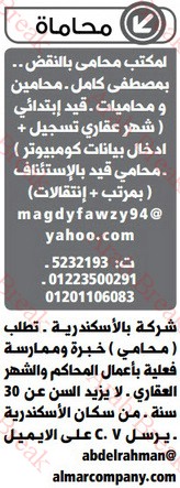 مطلوب محامي قيد إبتدائي لمكتب جنائي بمنطقه فيكتوريا اسكندريه يشترط التفرغ وقرب السكن مواعيد الإتصآل من الساعه 2 00م الي 10 00م ت. راجع بيانات الاتصال أو ارسال السيره. الأوراق المطلوبة للقيد محامي ابتدائى. مطلوب محامي او محاميه حديثي التخرج او قيد ابتدائي يتم ارسال ال cv مرفق بها عام التخرج التقدير الخبرات مكان الاقامه علي الايميل الأتي.
